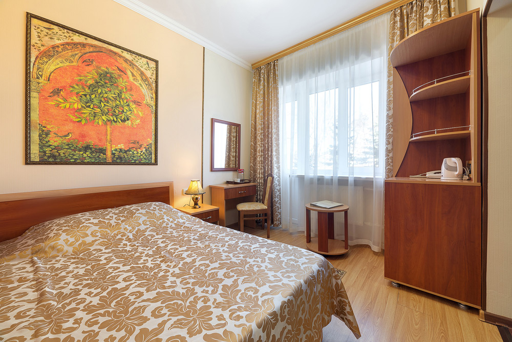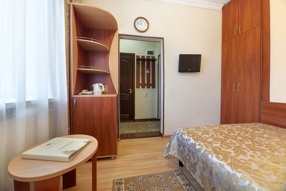 Площадь номера - 14 кв.м. 1 осн. место. Балкон. Мебель: зеркало, кровать односпальная, прикроватная тумбочка, стол, стул, шкаф. Оборудование: телевизор, телефон, холодильник, чайный набор посуды, электрочайник. Санузел: с ванной, туалетные принадлежности, фен. Сервис: Wi-Fi бесплатно, смена полотенец, смена постельного белья, уборка номера, услуги внутренней телефонной связи.