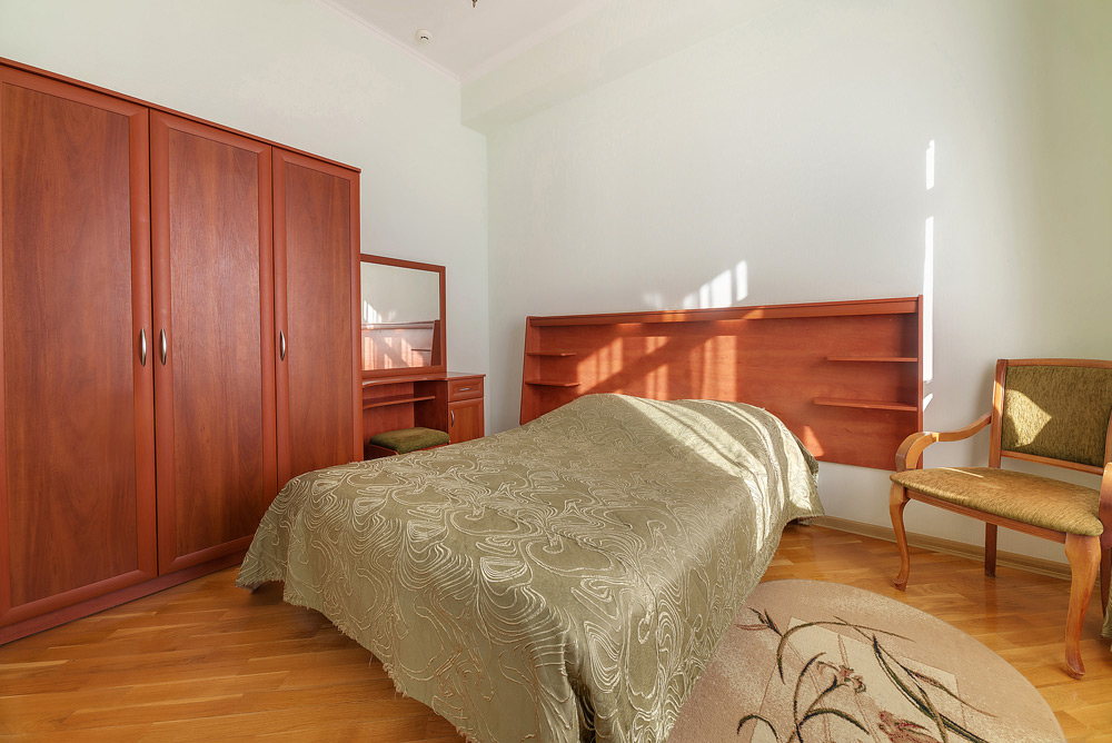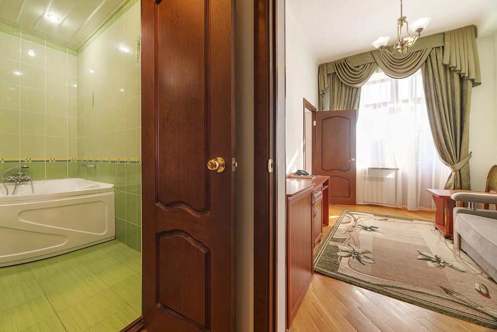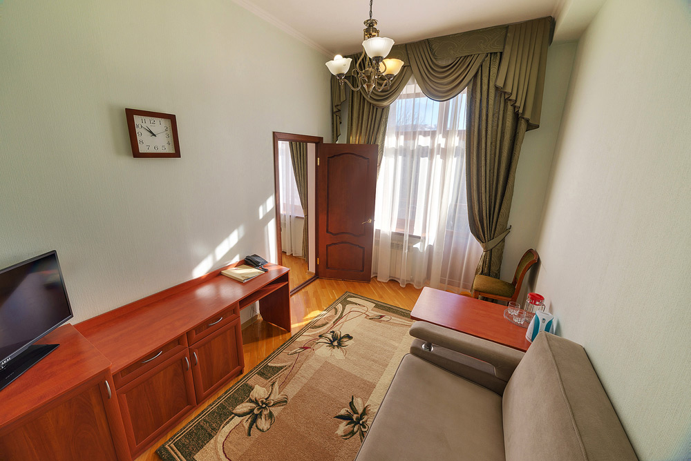Площадь номера - 35 кв.м. 2 осн. места. 2 доп. места. Балкон. Мебель: вешалка, диван, зеркало, кровать двуспальная, прикроватные тумбочки, стол, стулья, шкаф. Оборудование: сейф, телевизор, телефон, холодильник, чайный набор посуды, электрочайник. Санузел: с ванной, туалетные принадлежности, фен. Сервис: Wi-Fi бесплатно, смена полотенец, смена постельного белья, уборка номера, услуги внутренней телефонной связи.
