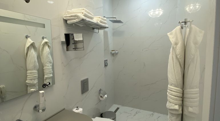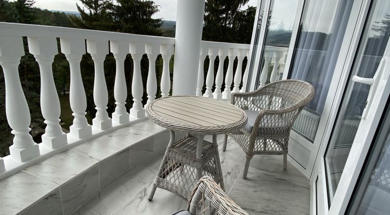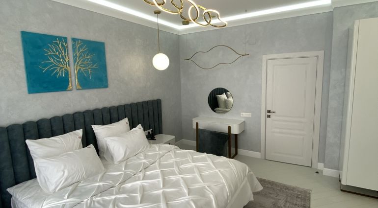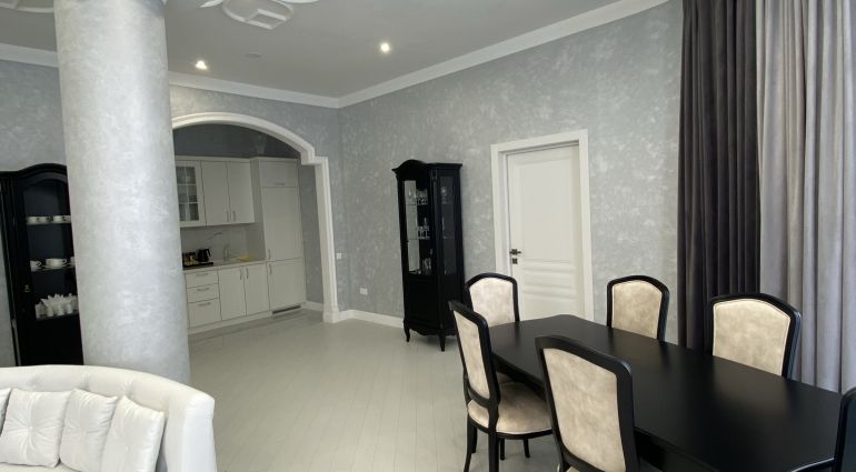 Площадь номера - 127 кв.м. 2 осн. места. 2 доп. места. Балкон. Мебель: вешалка, диван, зеркало, кровать двуспальная, прикроватные тумбочки, стол, стулья, шкаф. Мини-кухня. Оборудование: гладильная доска, кондиционер, микроволновая печь, набор посуды, плита электрическая, сейф, телевизор, телефон, утюг, холодильник, чайный набор посуды, электрочайник. Санузел: 2 санузла, биде, с душем, туалетные принадлежности, фен. Сервис: Wi-Fi бесплатно, смена полотенец, смена постельного белья, уборка номера, услуги внутренней телефонной связи.
