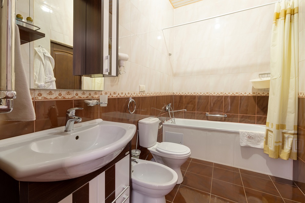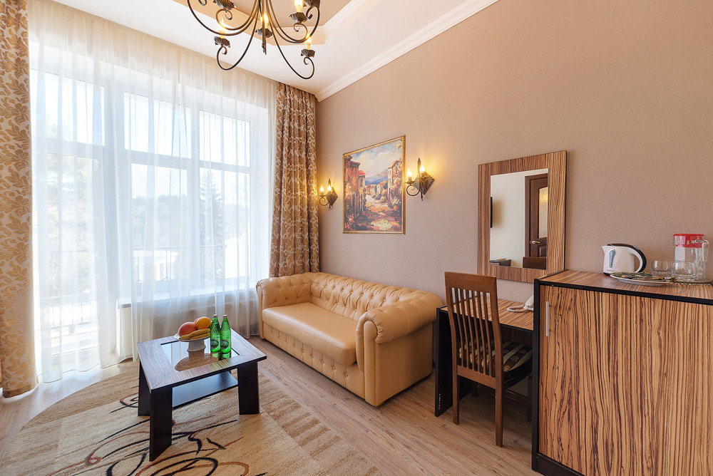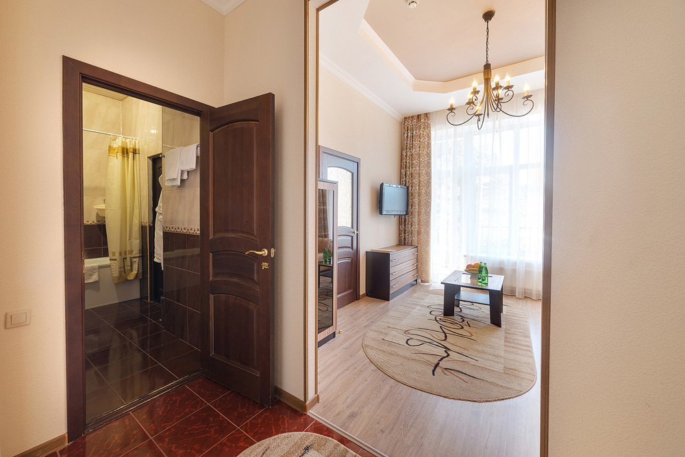 Площадь номера - 33,5 кв.м. 2 осн. места. 3 доп. места. Балкон. Мебель: вешалка, диван, зеркало, комод, кровати односпальные, кровать двуспальная, прикроватные тумбочки, стол, столик журнальный, стулья, шкаф. Оборудование: гладильная доска, кондиционер, набор посуды, сейф, телевизор, телефон, утюг, холодильник, чайный набор посуды, электрочайник. Санузел: биде, с ванной, туалетные принадлежности, фен. Сервис: Wi-Fi бесплатно, смена полотенец, смена постельного белья, уборка номера, услуги внутренней телефонной связи.